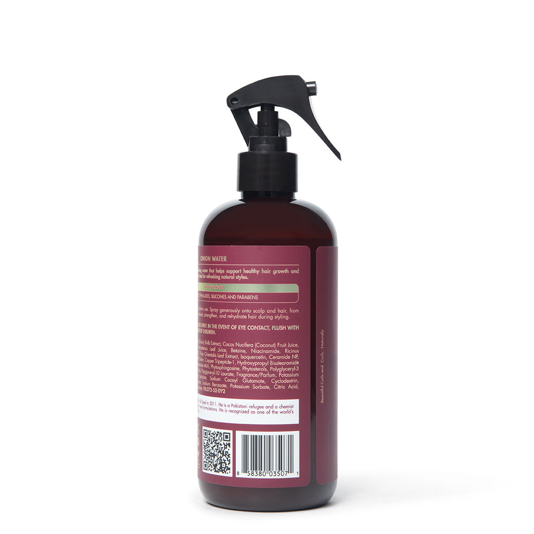 Het Onion Water is uniek samengesteld om het haar te versterken en te hydrateren terwijl het een gezonde haargroei bevordert en verharen vermindert. Het voegt glans toe, ondersteunt voller haar en hydrateert zowel het haar als de hoofdhuid diepgaand. Het is ideaal voor het opfrissen van natuurlijke stijlen, vlechten en de hoofdhuid.